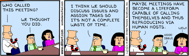 In our courses, we use the word institution in a far wider sense. In Wikipedia we find a useful definition from a political scientist: institutions are stable, valued, recurring patterns of behavior. Yet are they all really valued? Let’s take a look at this Dilbert comic strip: