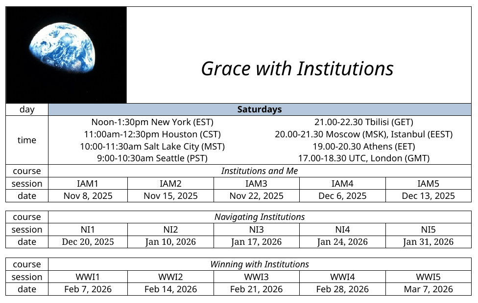 You can register in Institutions and Me if all five dates work for you. We expect you to be on all five sessions. If you are interested, contact us at grace-registration@rbox.me. You should also check the dates on the other two courses, because you will want to take those too. You need to have done the entirety of Institutions and Me before you can do Navigating Institutions, and both come before Winning with Institutuions. But if you do Institutions and Me now, and you want to wait till the next time we offer Navigating Institutions, you can do that too: we have been offering these courses once or twice per year, and we intend to continue to do so.