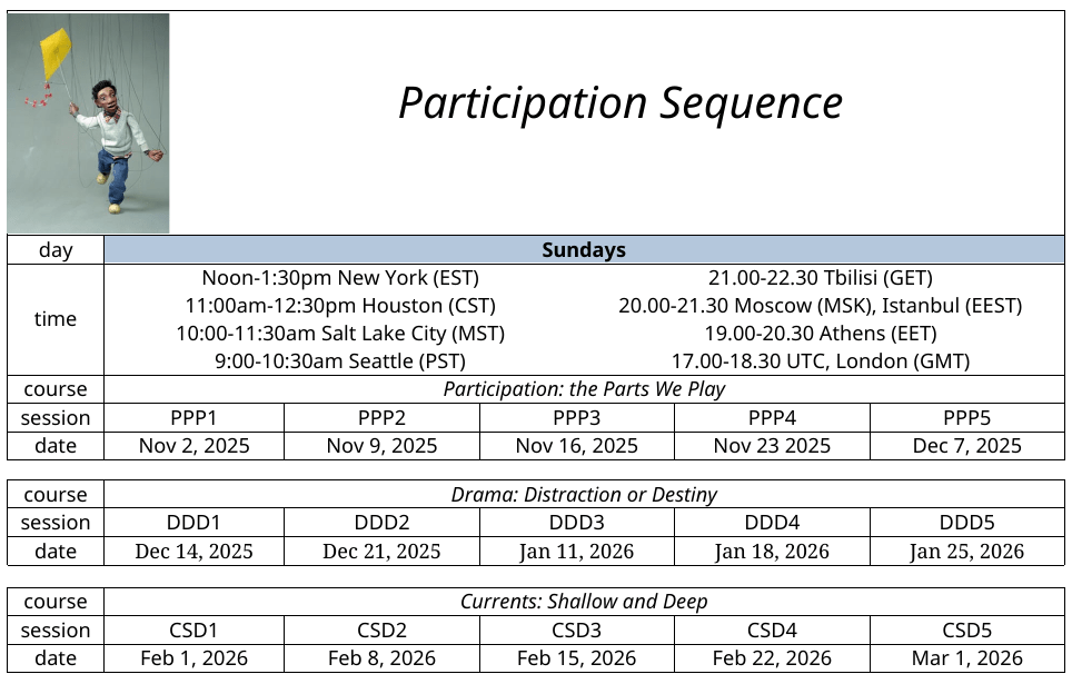 Note that these are held on Sundays, starting on November 2, 2025. To be eligible for Participation: the Parts we Play, you need to have completed the Grace with Institutions sequence. To be eligible for Drama; Distraction or Destiny you must have completed Parfticipation: the Parts we Play and so on.
